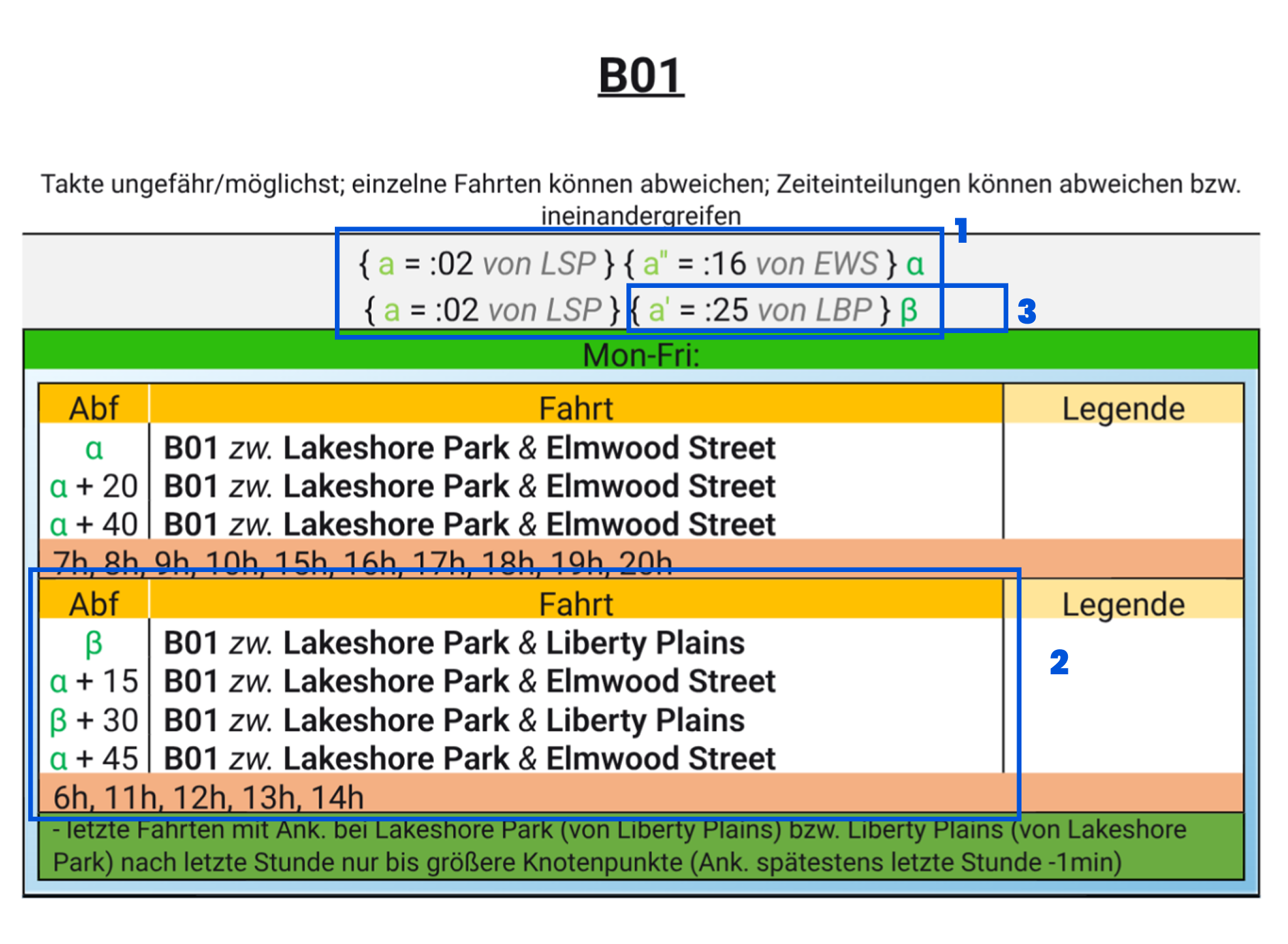 In 2 wird ein 15-Minuten-Takt beschrieben, der um 6:00 Uhr sowie im Zeitraum von 11:00 bis einschließlich 14:00 Uhr gilt. Innerhalb dieses Takts verkehrt jedes zweite Fahrzeug der Linie B01 nur zwischen Lakeshore Park (LSP) und Elmwood Street (EWS) anstatt die gesamte Strecke bis Liberty Plains (LBP) zu bedienen.