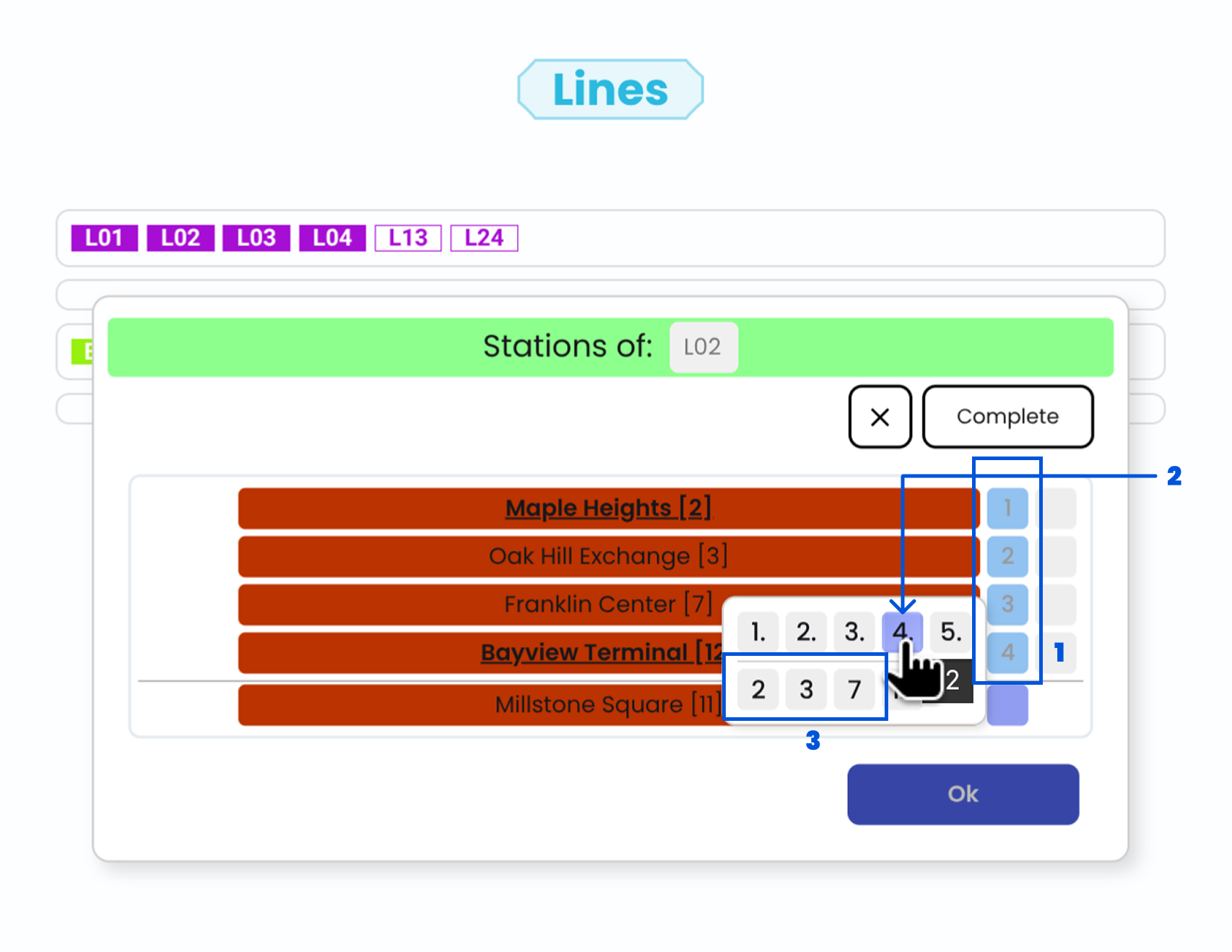 To edit the line path in detail, switch to the line editing mode. In this mode, the previously unsorted stops of a line can be brought into the desired order, so that a traceable route is created. For better overview, the stations can also be marked with position numbers (1, 2) that clarify their order within the line.
