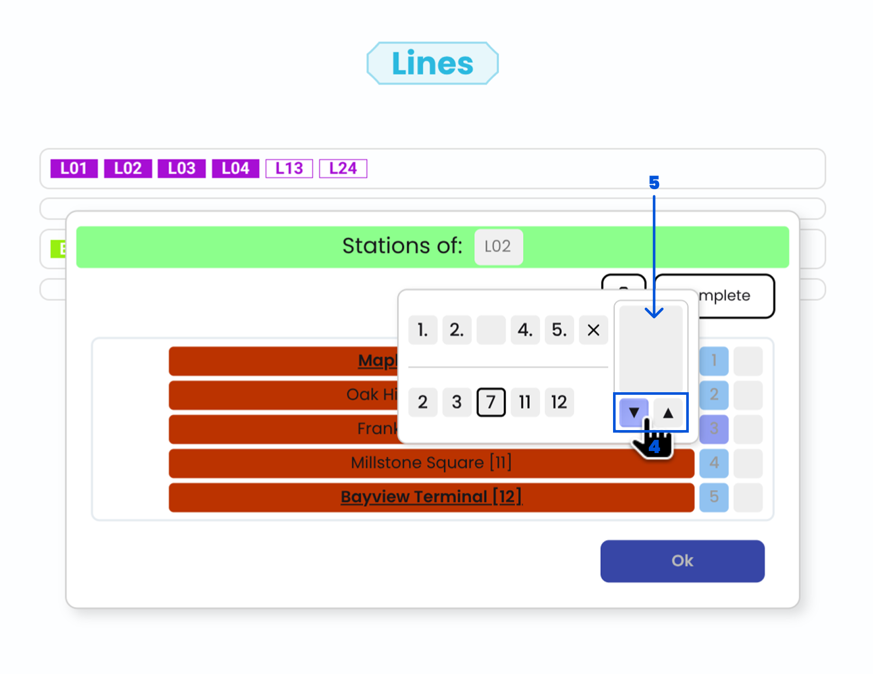 In addition to the simple order of the stops, further important properties of the route can be defined. In 4, it can be determined whether a station is only served in one direction, which is relevant for one-way roads or different return and outbound routes. Furthermore, in 5, branches can be configured, with which alternative line routes within a line can be displayed. It is possible to display several variants of a route, for example, when certain journeys only serve part of the route or have different end points. This enables flexible and realistic modeling of complex line structures.
